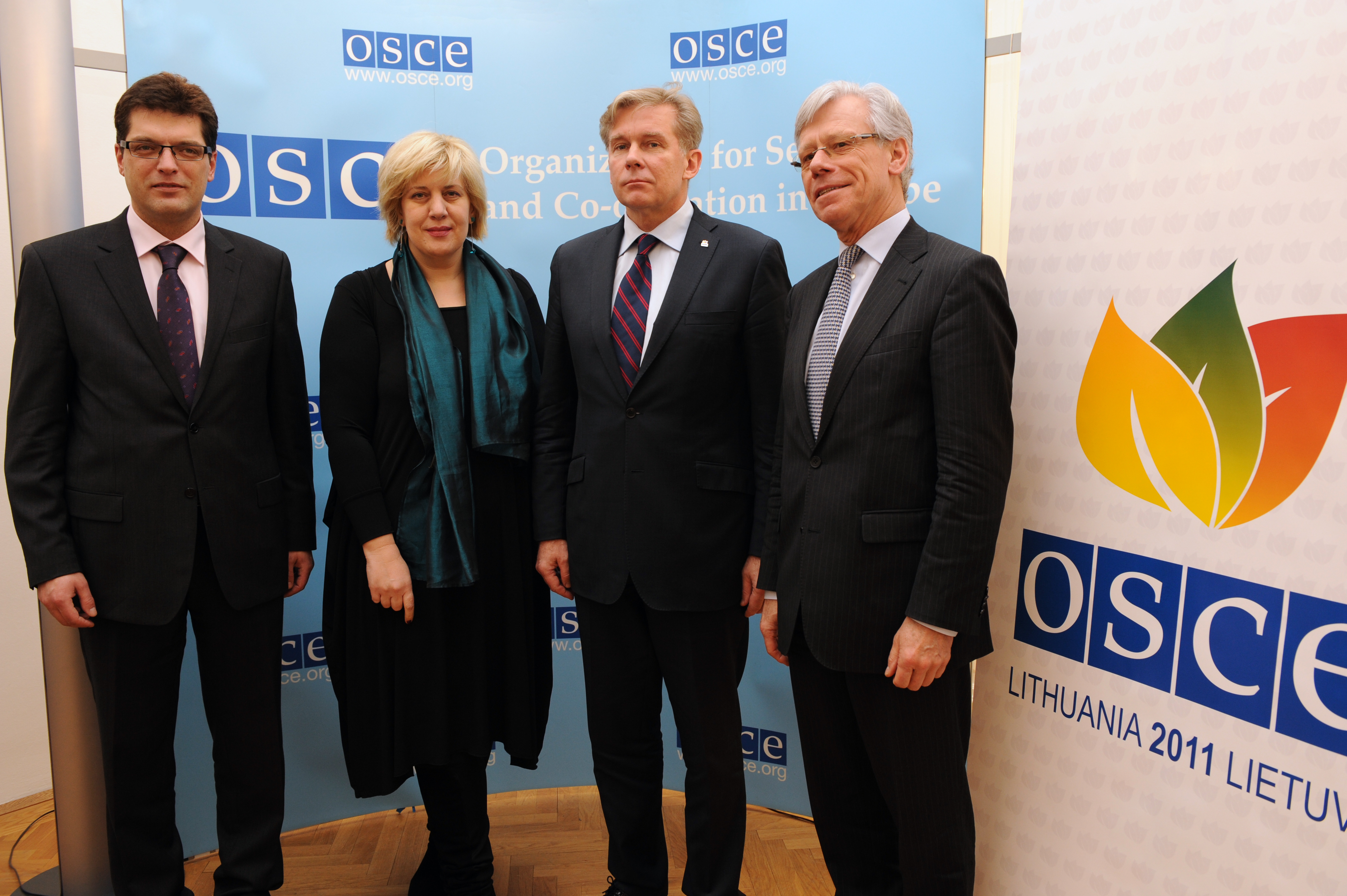 Left to right: ODIHR Director Janez Lenarčič, OSCE Representative on Freedom of the Media Dunja Mijatović, OSCE Chairperson-in-Office, Lithuanian Foreign Minister Audronius Ažubalis and OSCE High Commissioner on National Minorities Knut Vollebaek, Vienna, 13 January 2011.