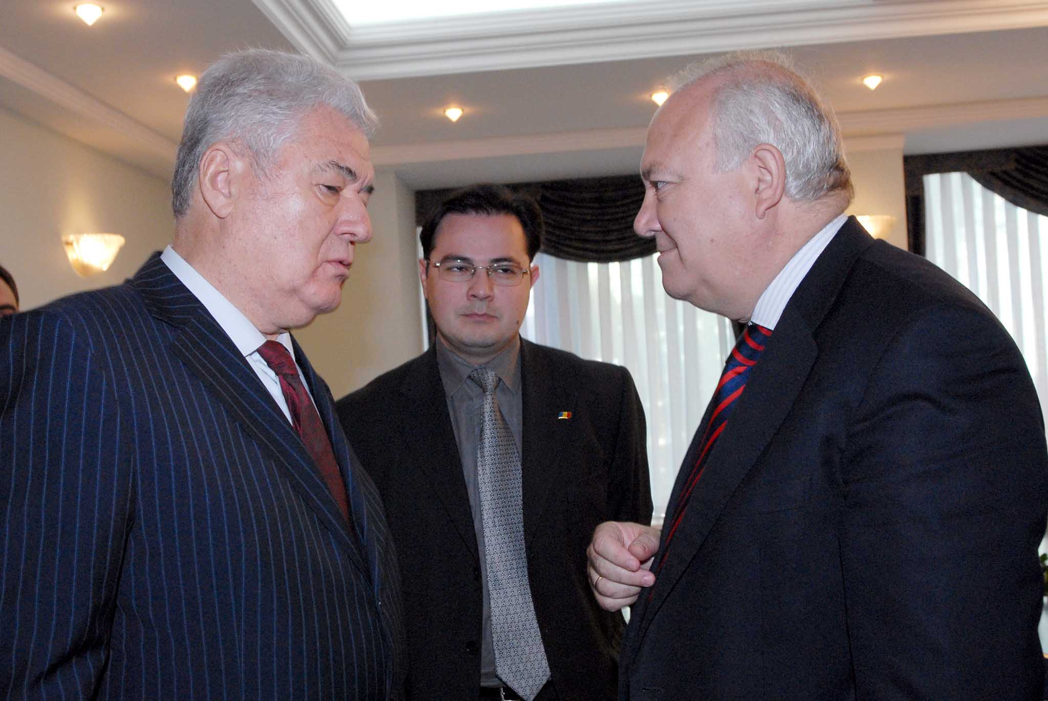 Angel Moratinos (right) meets the President of Moldova Vladimir Voronin (left) in Chisinau, 8 OCtober 2007.