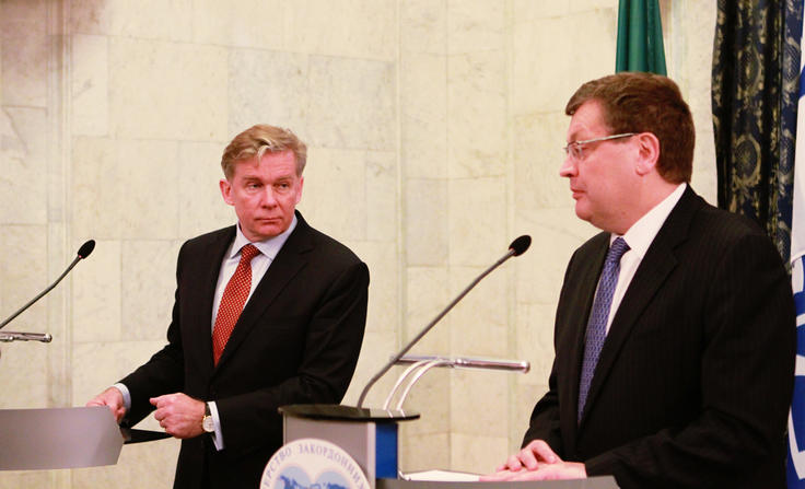 OSCE Chairperson-in-Office, Lithuanian Foreign Minister Audronius Ažubalis (l) and Ukraine's Foreign Minister Kostyantyn Gryshchenko at a news conference in Kyiv, 7 February 2011.