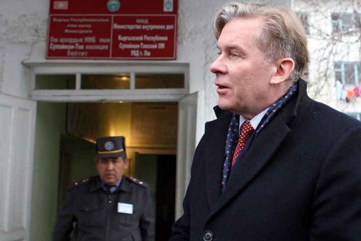 The OSCE Chairperson-in-Office, Lithuanian Foreign Minister Audronius Ažubalis (r), visits a local police station to discuss OSCE support for police reforms, in Osh, Kyrgyzstan, 2 March 2011.