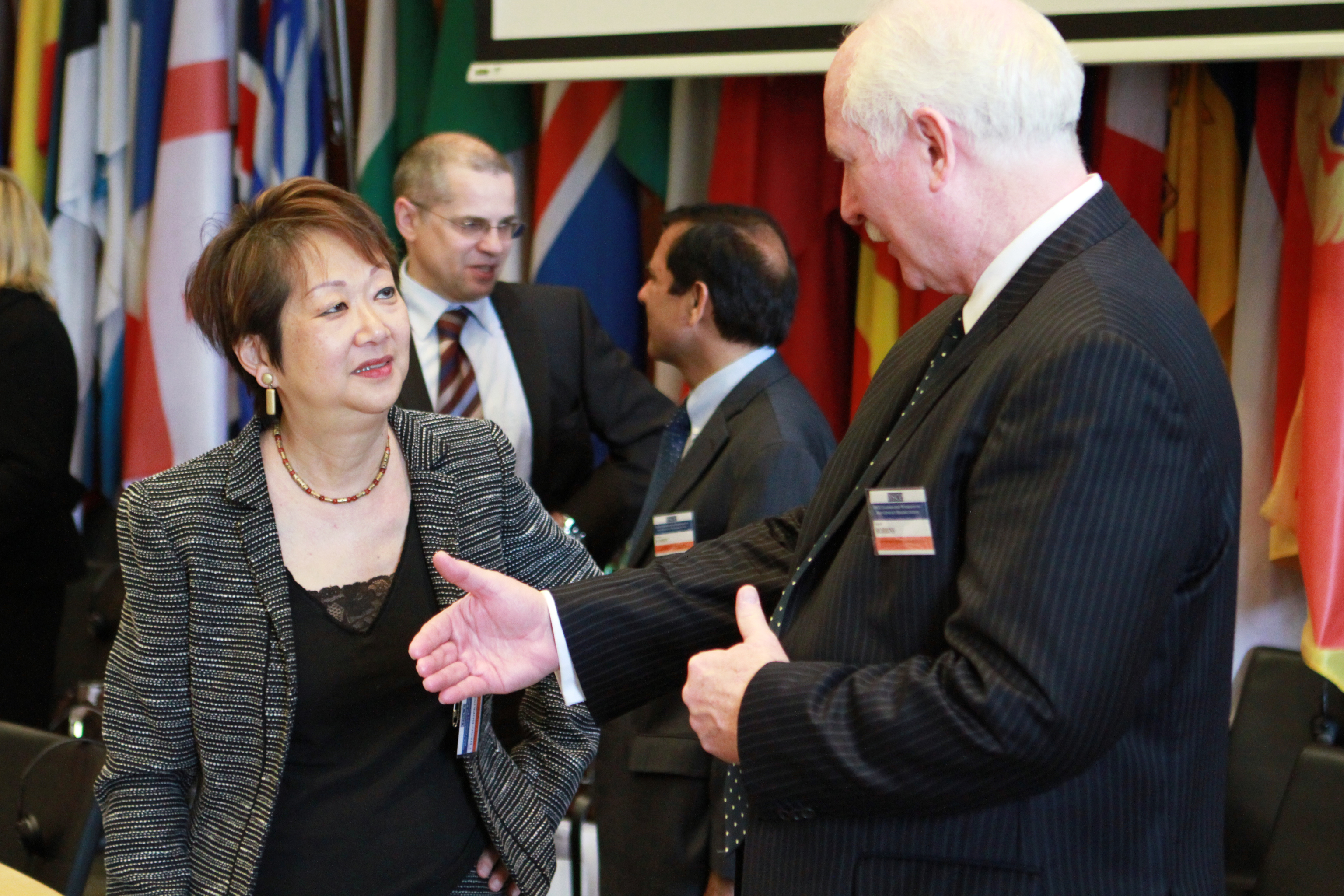 UN Assistant Secretary-General for Peacebuilding Support, Judy Cheng-Hopkins (l), speaks with the Head of the OSCE Mission to Bosnia and Herzegovina, Ambassador Gary D. Robbins, before the start of an OSCE Chairmanship workshop on post-conflict rehabilitation, Vienna, 2 May 2011.