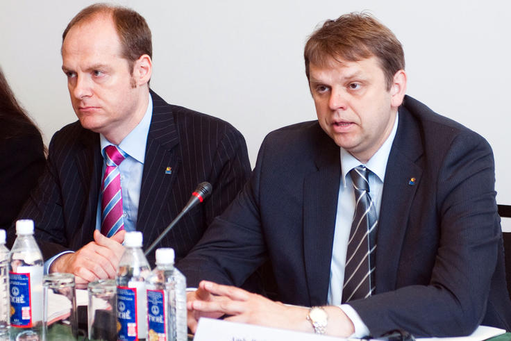 Ambassador Rytis Paulauskas (r), Director of the OSCE Chairmanship Department in Lithuania's Foreign Ministry, speaking at a seminar on border demarcation, alongside Gottfried Hanne, Deputy Director of the OSCE Conflict Prevention Centre, Vilnius, 31 May 2011.