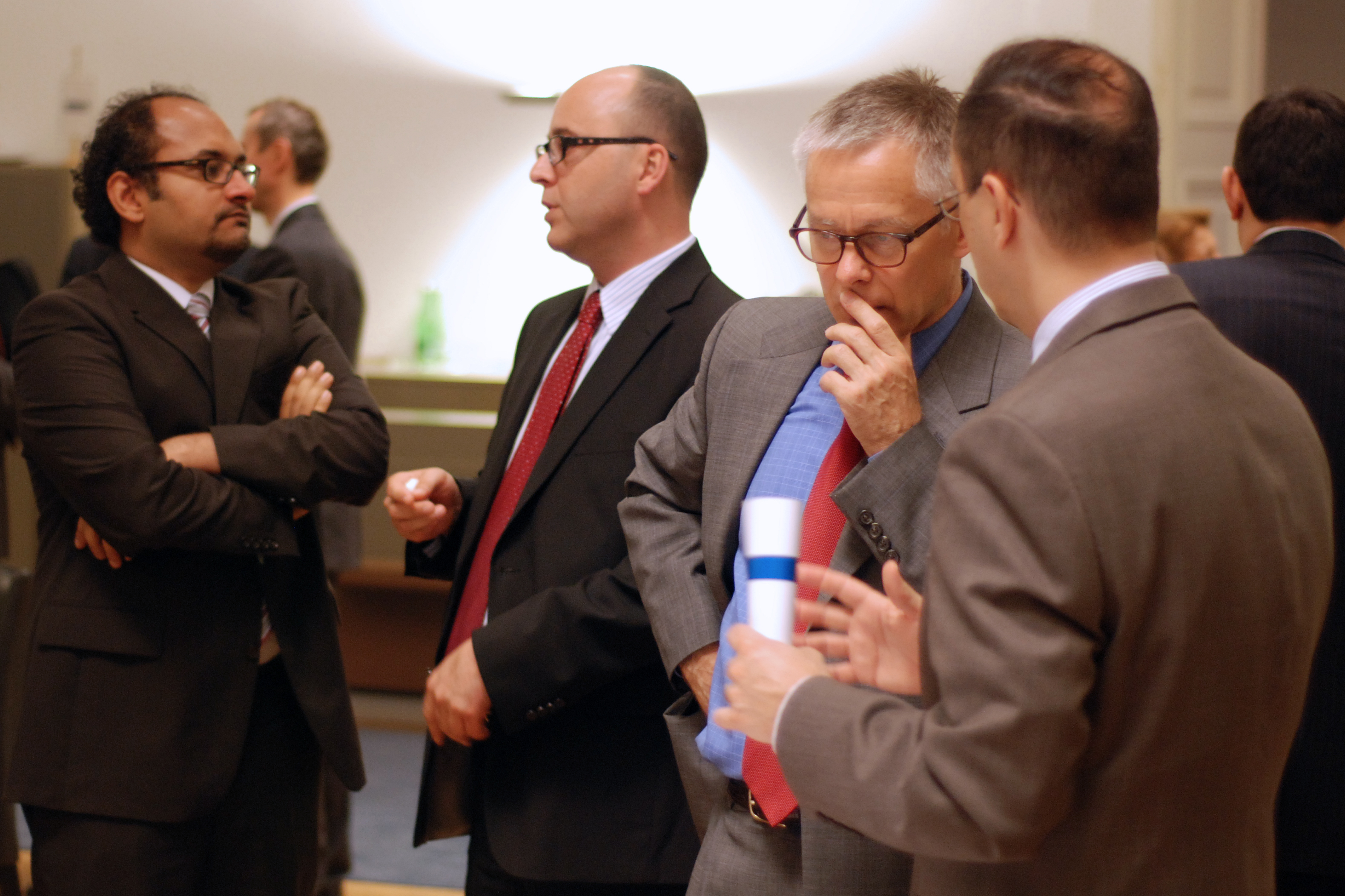 Participants of the "V to V Dialogue" expert meeting on strengthening the mediation-support capacity of the OSCE, speaking during a break, Vienna, 12 July 2011.