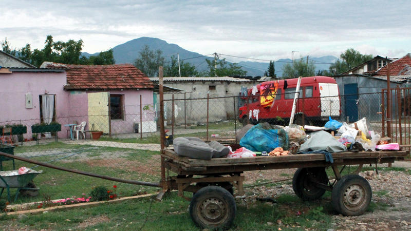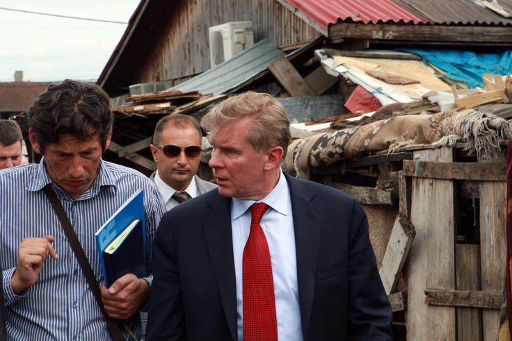 The OSCE Chairperson-in-Office, Lithuanian Foreign Minister Audronius Ažubalis (c) on a visit to gain first-hand experience of the conditions in Konik refugee camp, 5 July 2011.