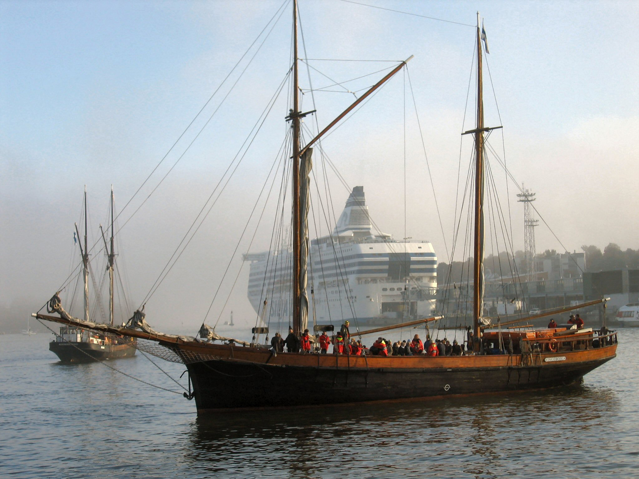 A beautiful sailing ship and a huge passenger ferry dominate the skyline in Helsinki's harbour.