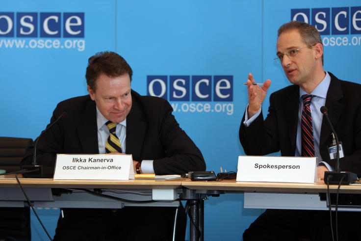 OSCE Chairman-in-Office, Finnish Foreign Minister Ilkka Kanerva, with the OSCE Spokesperson, Martin Nesirky (right), at a news conference in Vienna, 10 January 2008.