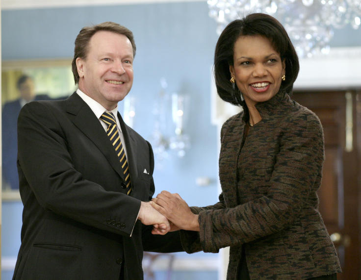OSCE Chairman-in-Office, Finnish Foreign Minister Ilkka Kanerva, with U.S. Secretary of State, Condoleezza Rice, in Washington, 11 February 2008.