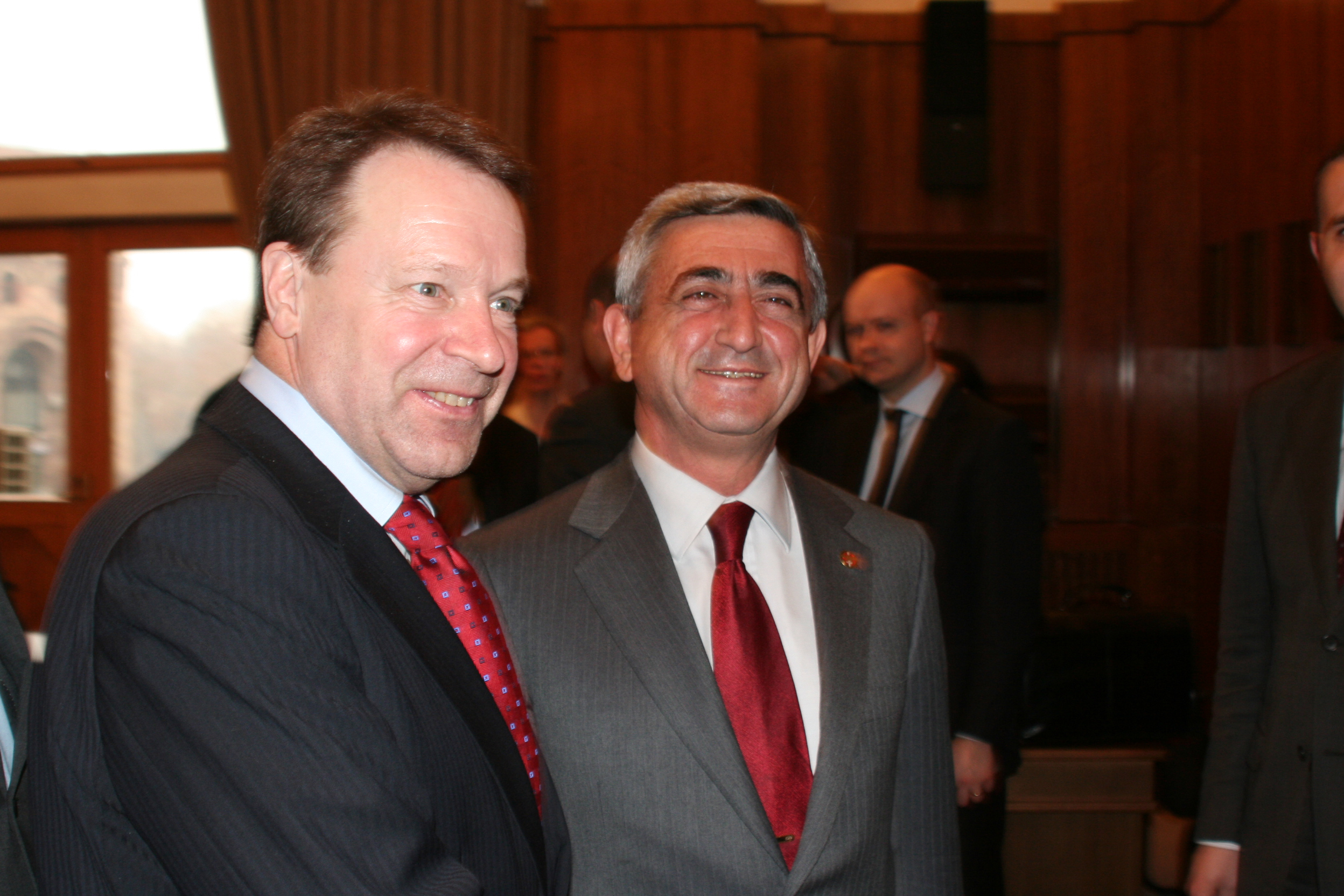 OSCE Chairman-in-Office, Finnish Foreign Minister Ilkka Kanerva (left), with outgoing Armenian Prime Minister and President-elect Serge Sargsyan in Yerevan, 26 February 2008.