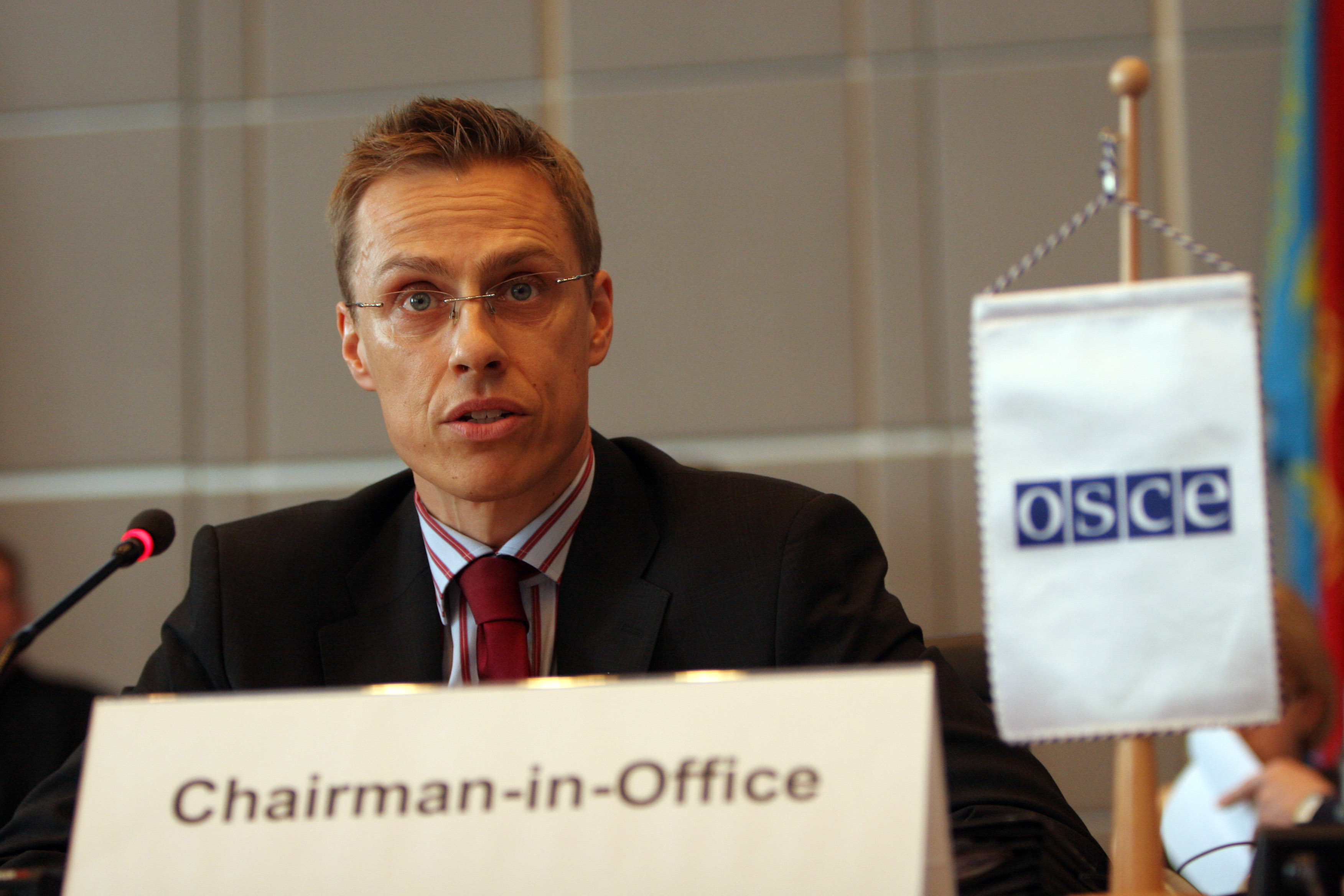 OSCE Chairman-in-Office, Finnish Foreign Minister Alexander Stubb, addresses the Permanent Council in Vienna, 10 April 2008.