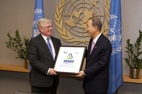 OSCE Chairperson-in-Office, Irish Deputy Foreign Minister Eamon Gilmore presents a copy of the Irish OSCE Chairmanship's commemorative stamp to UN Secretary General Ban Ki-moon in New York, 9 February 2012.