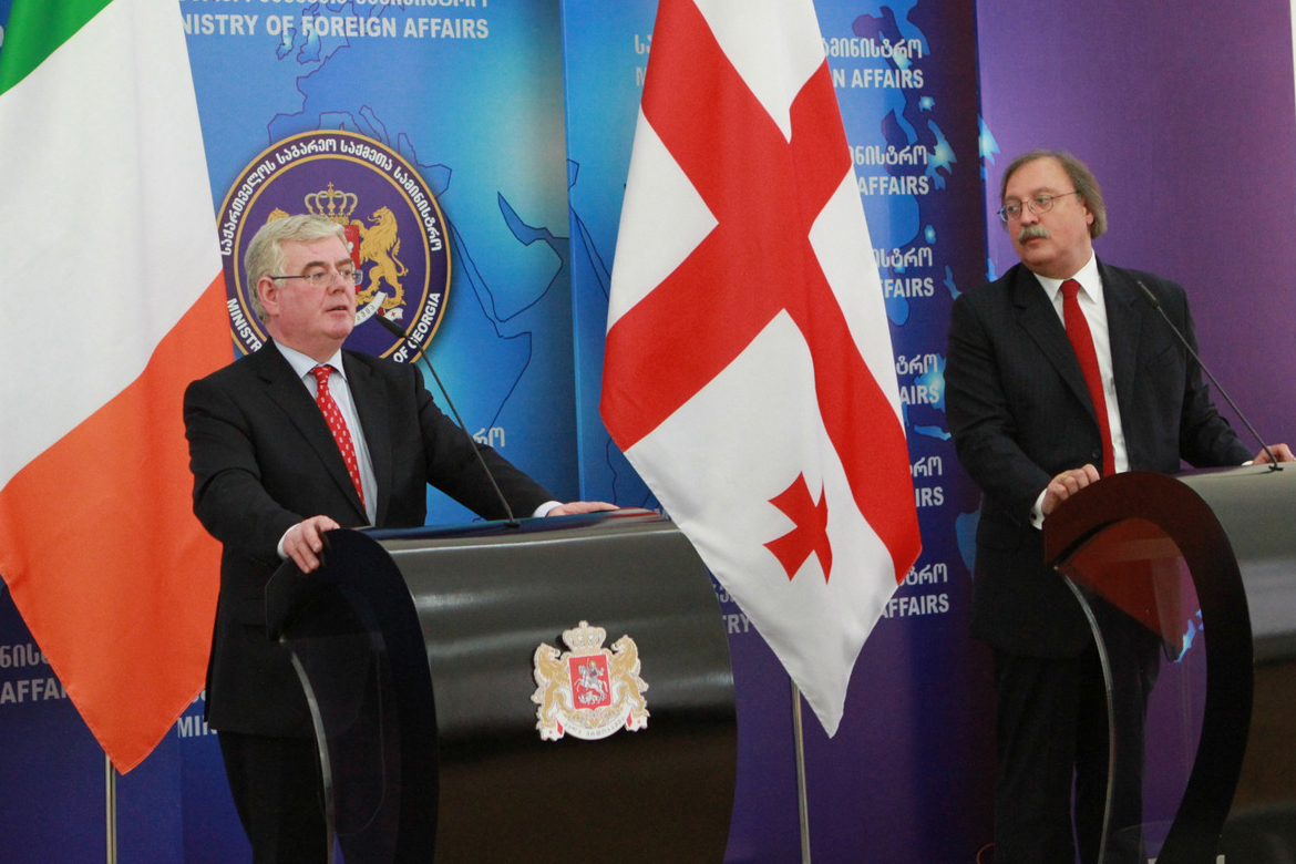 OSCE Chairperson-in-Office, Ireland's Deputy Prime Minister and Foreign Minister Eamon Gilmore (l) gives an address during a visit to Tbilisi, as Georgian Foreign Minister Grigol Vashadze listens on, 12 June 2012.