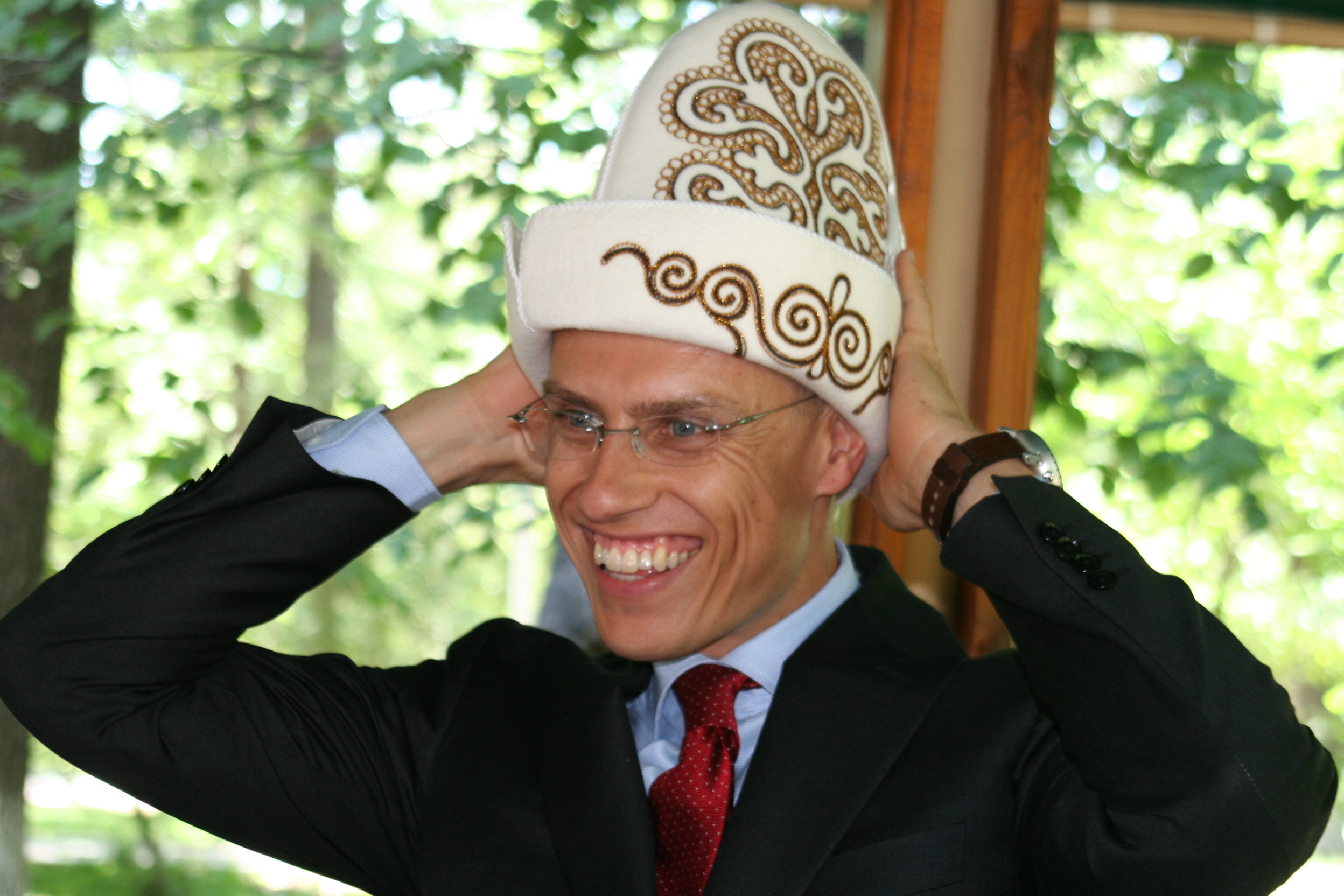 OSCE Chairman-in-Office and Finnish Foreign Minister Alexander Stubb tries on a traditional Kyrgyz hat during a trip to Bishkek, 1 July 2008.