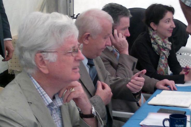 Ambassador Pádraig Murphy (l), Special Representative of the OSCE Chairperson-in-Office for the South Caucasus, and Ambassador Andrzej Tyszkiewicz, Head of EUMM, ahead of an extraordinary meeting under the Incident Prevention and Response Mechanism, co-facilitated by the EUMM and the OSCE, Zardiantkari, 14 July 2012.