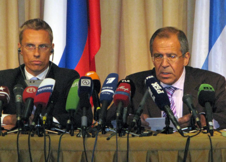 Russian Foreign Minister Sergey Lavrov (Right) with OSCE Chairman-in-Office, Finnish Foreign Minister Alexander Stubb, during a news conference in Moscow, 12 August 2008.
