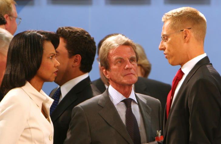 U.S. Secretary of State Condoleezza Rice (left), French Foreign Minister Bernard Kouchner (centre), and OSCE Chairman-in-Office Alexander Stubb, in Brussels, 19 August 2008.