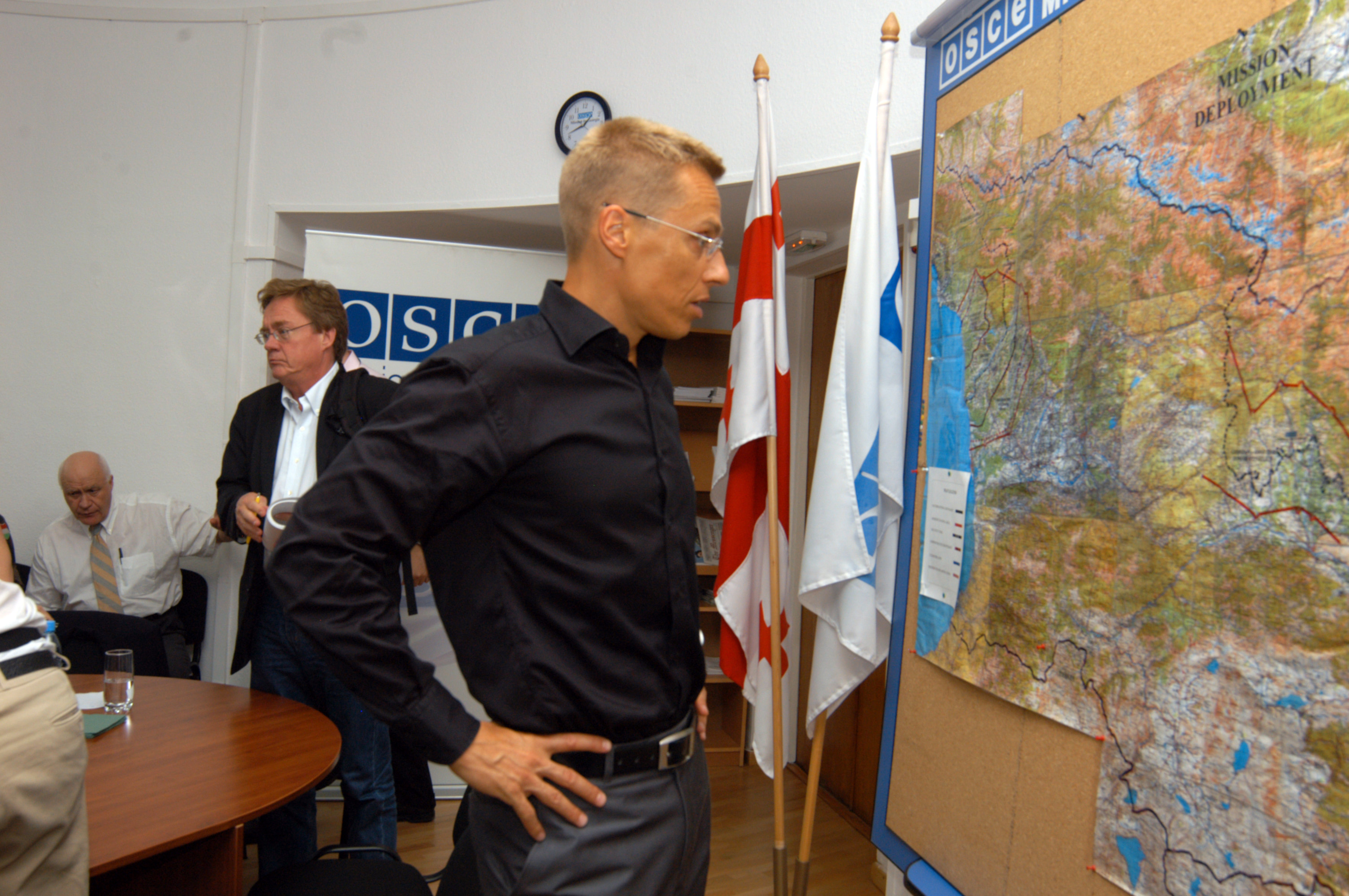 OSCE Chairman-in-Office, Finnish Foreign Minister Alexander Stubb, looks at a map of the region during a visit to Tbilisi, 21 August 2008.