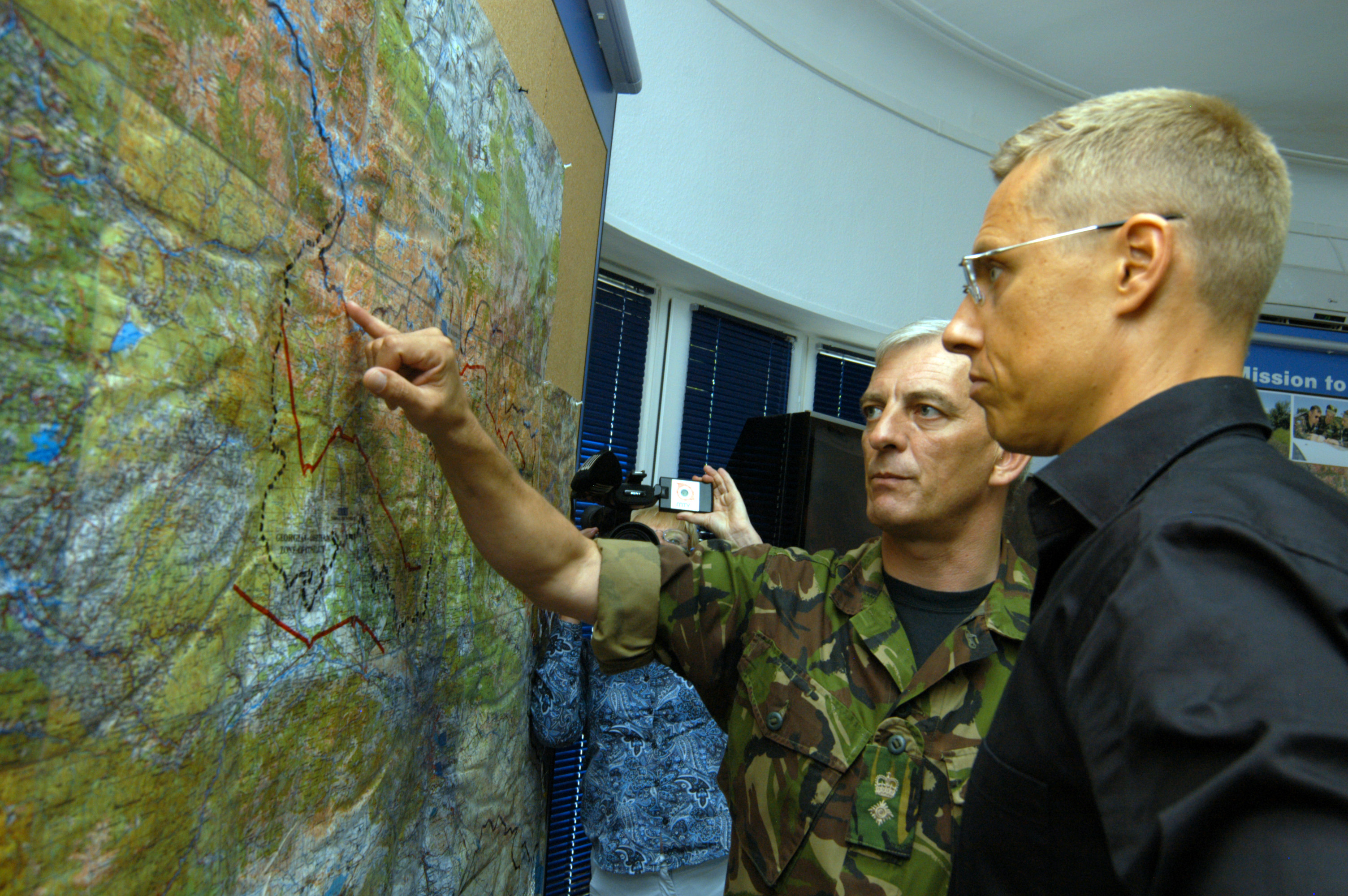 OSCE Chairman-in-Office, Finnish Foreign Minister Alexander Stubb (right), looks at a map of the region with an OSCE military monitoring officer during a visit to Tbilisi, 21 August 2008.