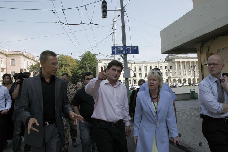 OSCE Chairman Alexander Stubb (left) and Ambassador Terhi Hakala (right), Head of the OSCE Mission to Georgia, in Gori, 21 August 2008.