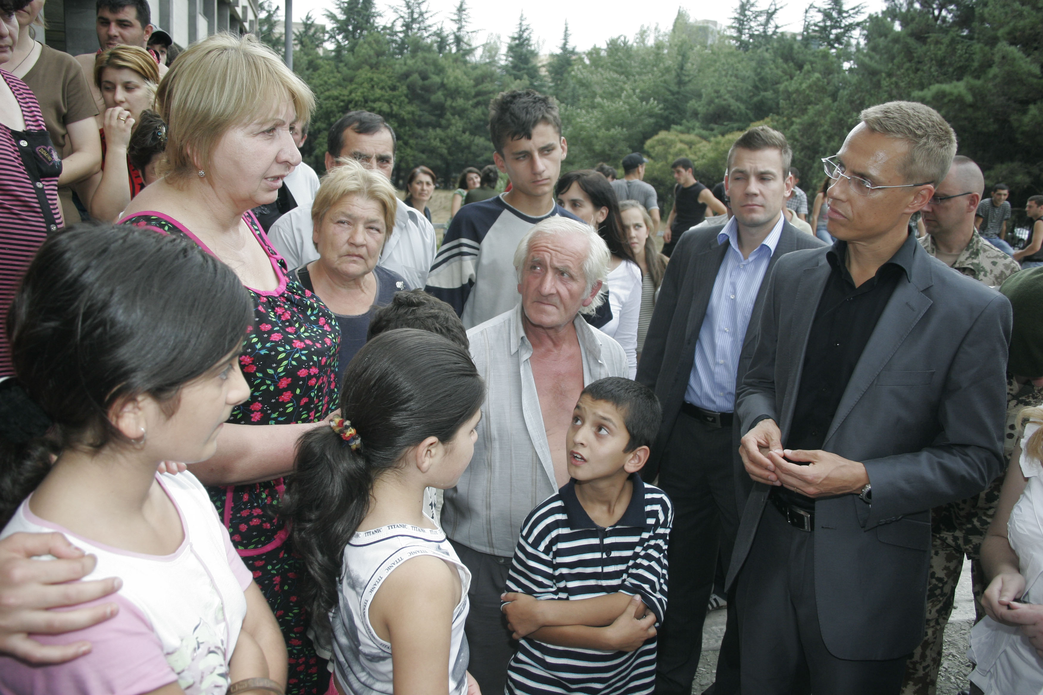 OSCE Chairman Alexander Stubb (right) meets refugees in the Georgian capital Tbilisi, 21 August 2008.