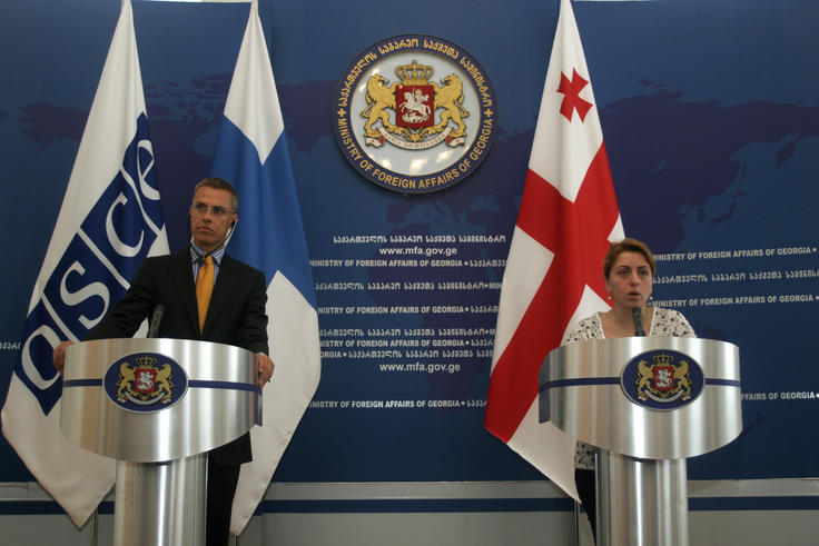 OSCE Chairman Alexander Stubb and Georgian Foreign Minister Ekaterina Tkeshelashvili (right) at a news conference in Tbilisi, 22 August 2008.