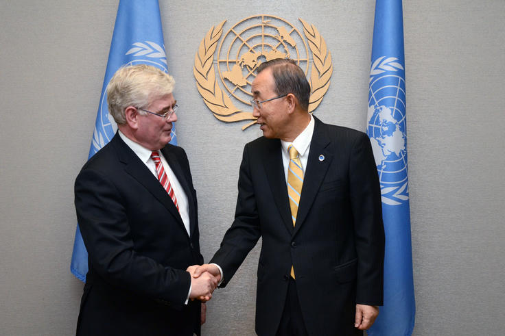 The OSCE Chairperson-in-Office, Ireland's Deputy Prime Minister and Minister for Foreign Affairs and Trade Eamon Gilmore meets UN Secretary-General Ban Ki-moon at the United Nations during the sixty-seventh session of the General Assembly, New York, 28 September 2012.