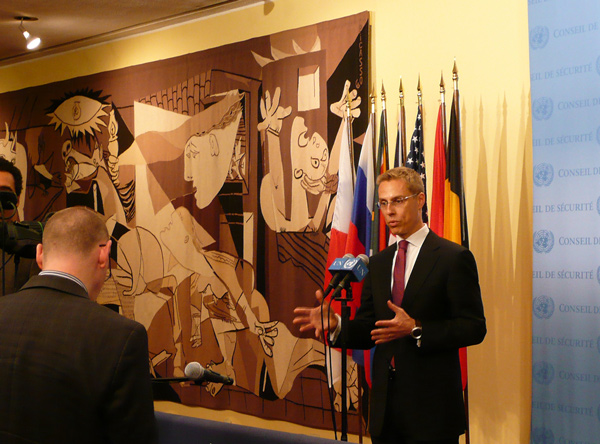 OSCE Chairman-in-Office Alexander Stubb speaks to journalists at the United Nations in New York, 26 September 2008.