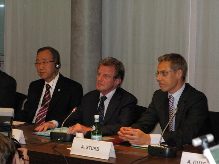 OSCE Chairman Alexander Stubb (right) with French Foreign Minister Bernard Kouchner and United Nations Secretary General Ban Ki-moon (left) in Geneva, 14 October 2008.