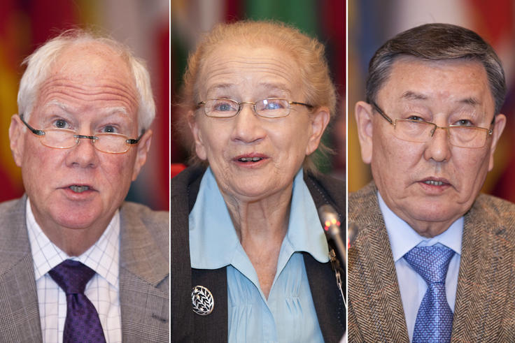 L-r: The Personal Representative of the OSCE Chairperson-in-Office on Combating Anti-Semitism, Rabbi Andrew Baker; the Personal Representative on Combating Racism, Xenophobia and Discrimination, also focusing on Intolerance and Discrimination against Christians and Members of Other Religions, Justice Catherine McGuinness; and the Personal Representative on Combating Intolerance and Discrimination against Muslims, Senator Adil Akhmetov addressing the OSCE's Permanent Council in Vienna, 15 November 2012.