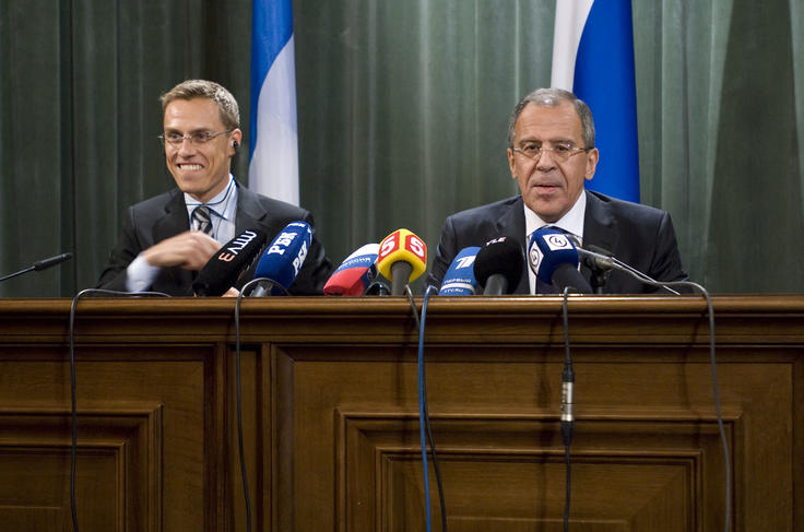 Russian Foreign Minister Sergey Lavrov (Right) with OSCE Chairman Alexander Stubb, at a news conference following their talks in Moscow, 11 November 2008.