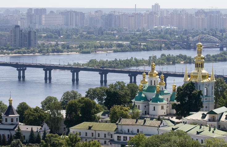 Residential buildings rise up across the Dnieper River from the Monastery of the Caves, a UNESCO World Heritage Site, in the Ukrainian capital of Kyiv.
