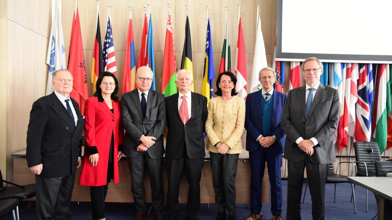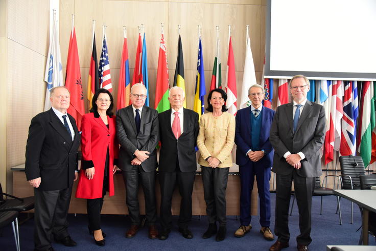 The newly elected Bureau meets in Vienna for its investiture meeting. From left to right: Erkki Kourula, Verica Trstenjak, Emmanuel Decaux, Christian Tomuschat, Anne Rambberg, Riccardo Pisillo Mazzeschi, Mats Melin.