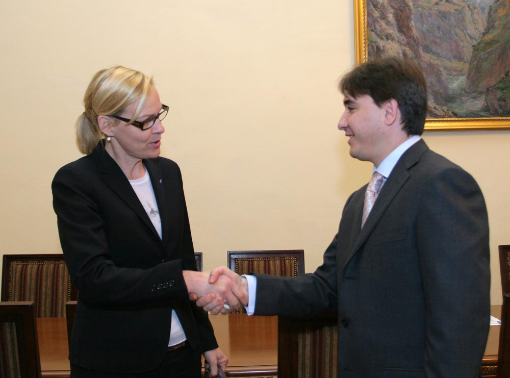 Eva Biaudet (l), OSCE Special Representative for Combating Trafficking in Human Beings, and Armen Gevorgyan (r), Armenian Vice-Prime Minister and Minister of Territorial Administration, at the Ministry during an official visit to Yerevan, 8 May 2009.