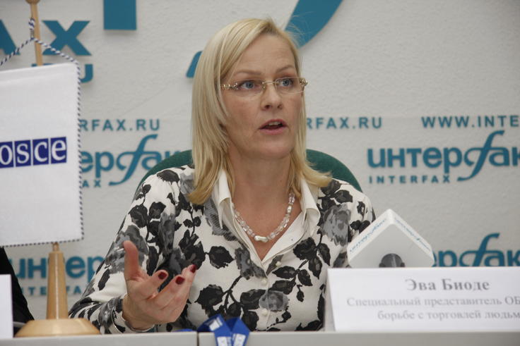 Eva Biaudet, the OSCE Special Representative for Combating Trafficking in Human Beings, speaks to the media during a trip to Moscow to discuss international co-operation in combating trafficking, 20 November 2009.