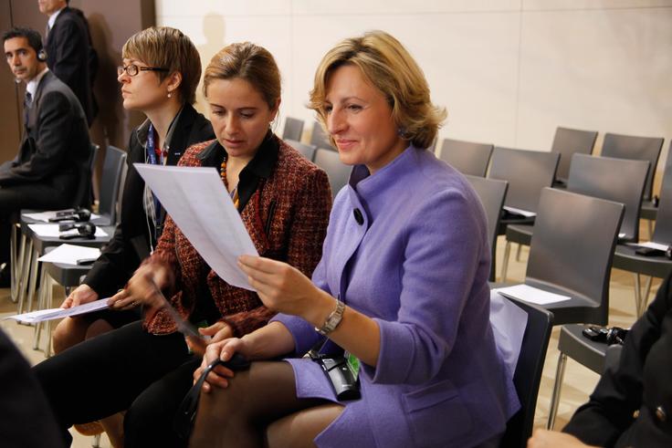 OSCE Deputy Co-ordinator for combating human trafficking, Ruth Pojman (r), press officer Blanca Tapia (c) and human trafficking advisor Natalia Ollus (l) during the 17th Ministerial Council in Athens, 1 December 2009.