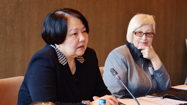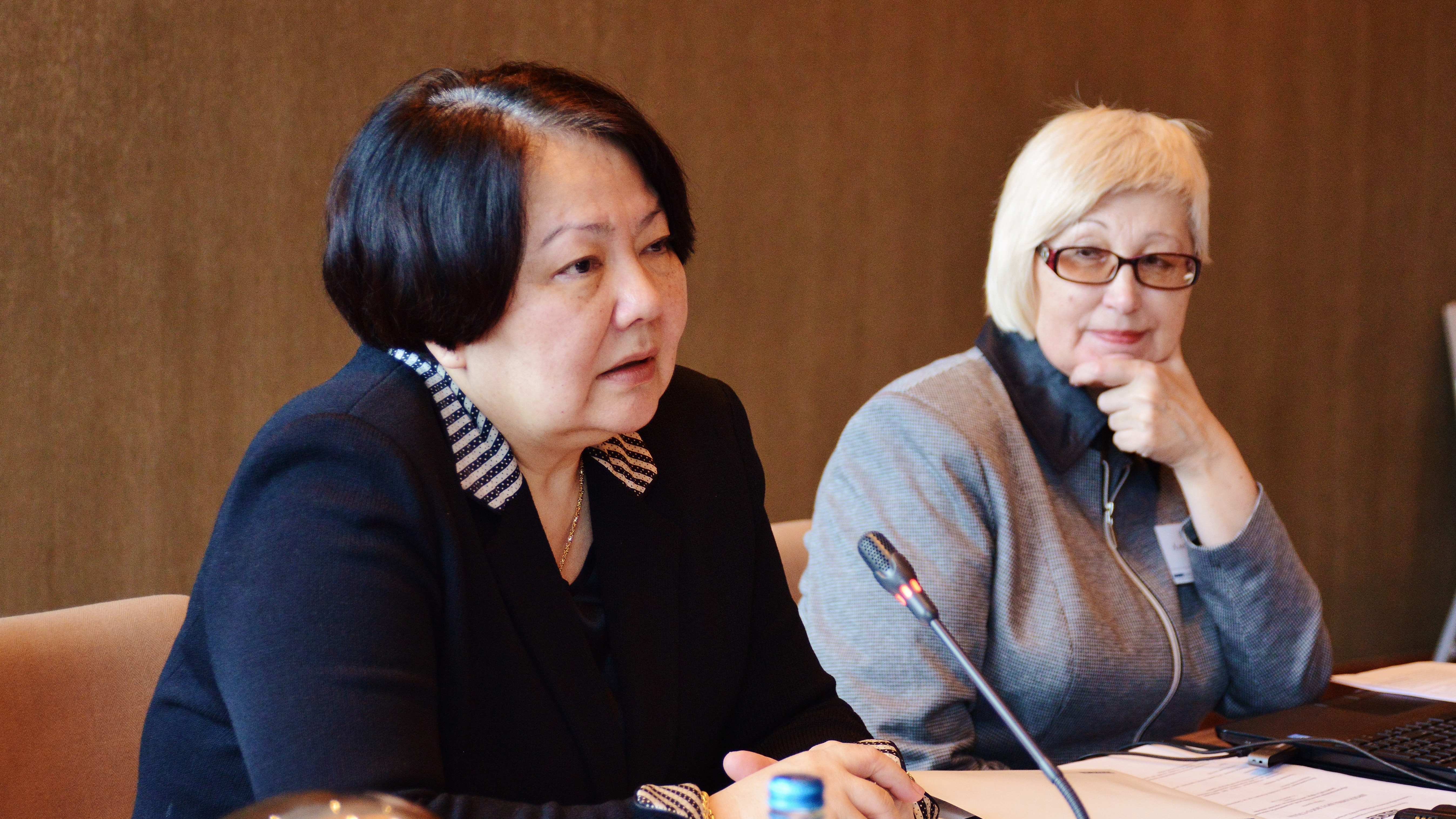 L-r: OSCE Special Representative and Co-ordinator for Combating Trafficking in Human Beings, Ambassador Madina Jarbussynova and expert Nadezhda Karaseva during a roundtable on preventing trafficking in children without parental care, Minsk, 2 April 2015.