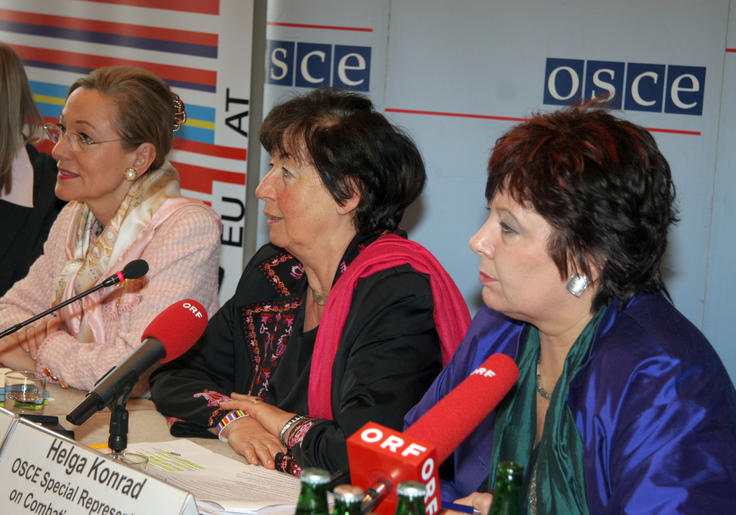 OSCE Special Representative on Combating Trafficking in Human Beings Helga Konrad (r), Austrian Interior Minister Liese Prokop (c) and EU Commissioner for External Relations Benita Ferrero-Waldner (l) at a news conference in Vienna, 17 March 2006.