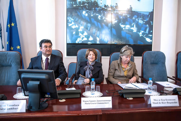 OSCE Special Representative and Co-ordinator for Combating Trafficking in Human Beings Maria Grazia Giammarinaro (c) takes part in an event at the headquarters of the Inter-parliamentary Assembly of Member Nations of the CIS, St. Petersburg, 18 April 2012.