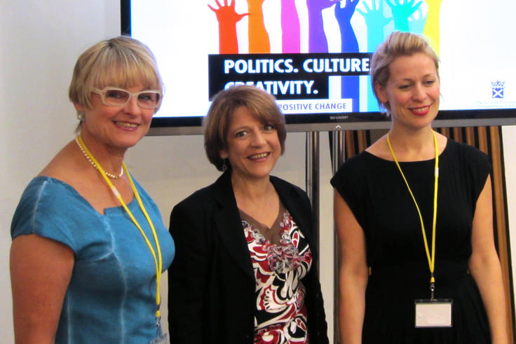 OSCE Special Representative and Co-ordinator for Combating Trafficking in Human Beings, Maria Grazia Giammarinaro (c), at the Festival of Politics hosted by the Scottish Parliament, alongside Scottish actor and director Cora Bissett (r) and Trish Davidson, founder and director of the Unchosen anti-trafficking charity, Edinburgh, 24 August 2012.