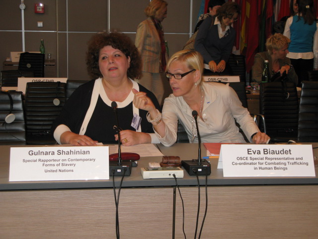 OSCE Special Representative on combating human trafficking, Eva Biaudet (right), and UN Special Rapporteur on Contemporary Forms of Slavery, Gulnara Shahinian, at a seminar on national anti-trafficking rapporteurs in Vienna, 23 September 2008.