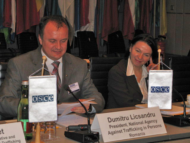 The President of Romania's National Agency against Trafficking in Persons, Dumitru Licsandru (left), and Allen Beck, Senior Advisor, US Department of Justice, at a seminar on national anti-trafficking rapporteurs in Vienna, 23 September 2008.