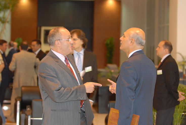 From left: Amb. Dan Ashbel, Head of the Delegation of Israel to the OSCE, and Amb. Ramzy Ezz Eldin Ramzy, Head of the Egyptian Delegation, discuss at the 2006 OSCE Mediterranean Seminar in Sharm El-Sheik, 6 November 2006.