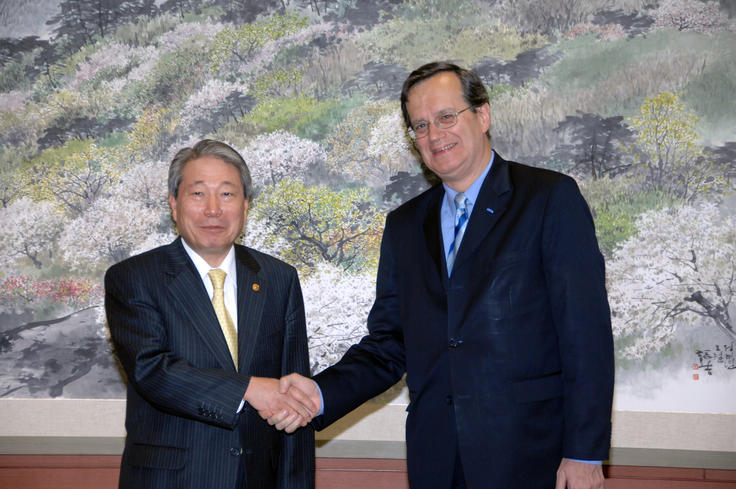 OSCE Secretary General Marc Perrin de Brichambaut (right) with South Korean Foreign Minister Yu Myung-hwan in Seoul, 29 April 2008.