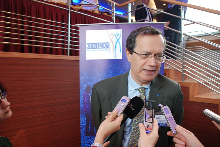 OSCE Secretary General Marc Perrin de Brichambaut speaks to journalists at a two-day conference on the security implications of climate change, Bucharest, 5 October 2009.