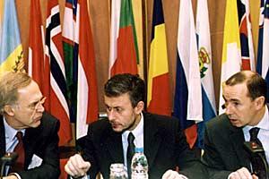 Daan Everts Head of the OSCE Task Force at the Dutch Foreign Ministry (left), Bulgarian Minister of Foreign Affairs, Solomon Passy (centre), Marc Baltes, Deputy Co-ordinator of OSCE Economic and Environmental Activities, Sofia, 11 November 2002.