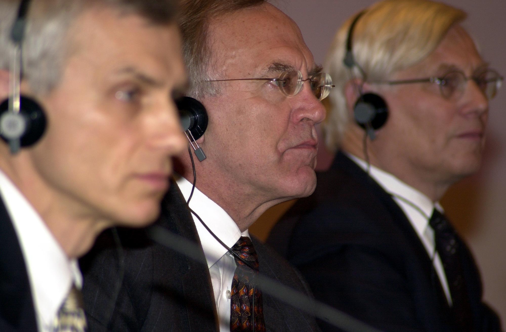 Marcin Swiecicki, Co-ordinator on OSCE Economic and Environmental Activities, Daan Everts, Personal Representative of the OSCE CiO, and Jan van Dijk, UNODC, at an OSCE seminar on drugs trafficking in Tashkent, Uzbekistan, 17 and 18 March 2003.