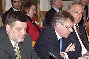 OSCE Secretary General Jan Kubis (left) listens to a speech by the Chairman-in-Office Jaap de Hoop Scheffer (centre) at the opening of the 11th Economic Forum in Prague, 20 May 2003.
