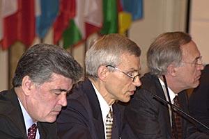 Deputy Foreign Minister of Uzbekistan, Ilkhom Nematov (left), Co-ordinator of OSCE Economic and Environmental Activities, Marcin Swiecicki (centre), and Personal Representative of the OSCE CiO, Daan Everts, in Tashkent Seminar, 17 March 2003.