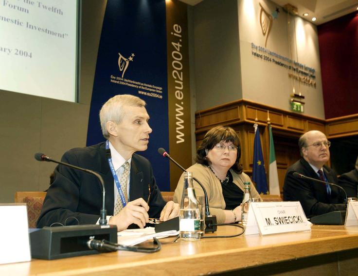 Irish Deputy Prime Minister Mary Harney listens to Marcin Swiecicki, Co-ordinator of OSCE Economic and Environmental Activities (left), at the OSCE's Dublin Seminar on Stimulating Foreign and Domestic Investments, 16 February 2004.