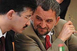 Head of the Statistical Department, University of Ljubljana, Professor Janez Malacic (right), speaks to conference officer, Yershan Birtanov, during the 13th Economic Forum, Prague, 23 May 2005.