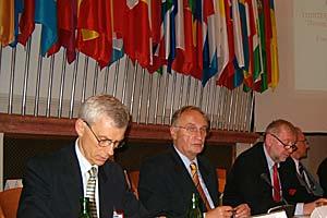 From left: Marcin Swiecicki, Co-ordinator of OSCE Economic and Environmental Activities, Amb. Boris Frlec, Chairperson of the Economic Forum and OSCE Chairman, Slovenian Foreign Minister Dimitrij Rupel at the 13th Economic Forum, Prague, 23 May 2005.
